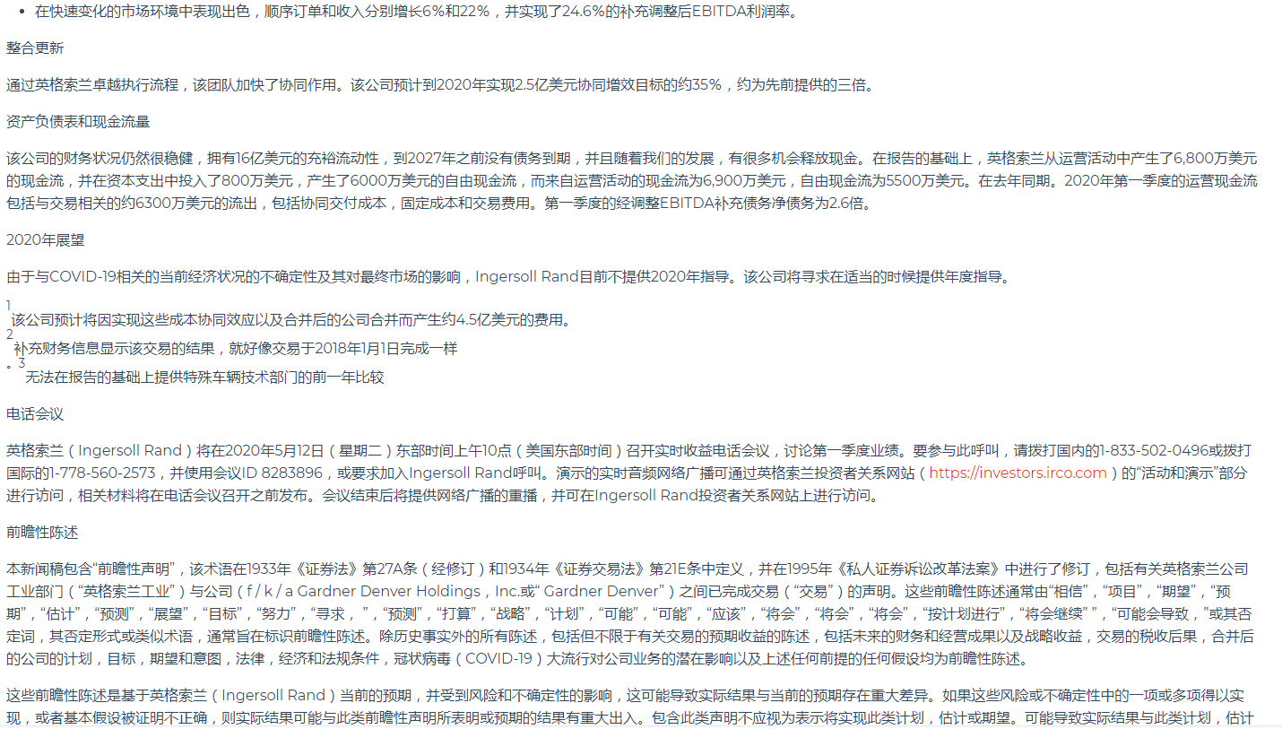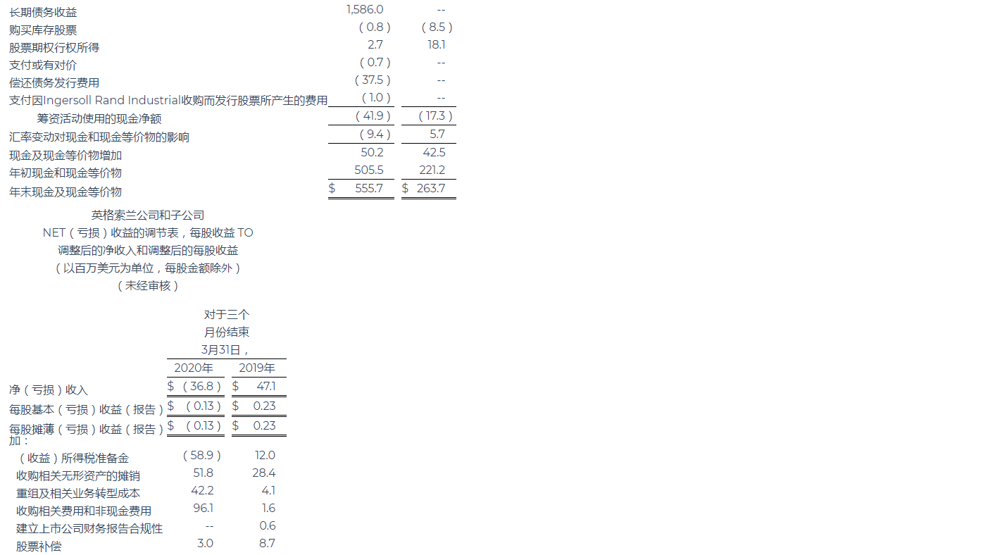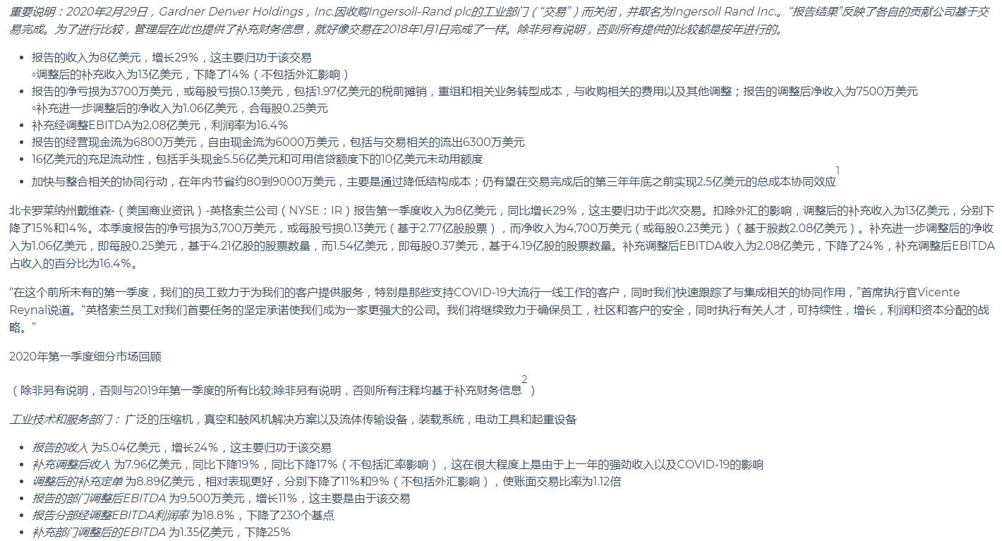 英格索蘭公布2020年第一季度業績